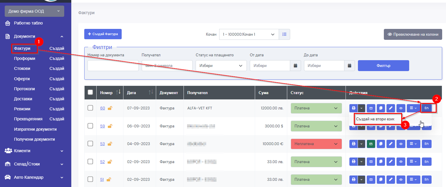 1.1. От списъка с фактури кликнете на бутона En (1) / Създай на втори език (2)