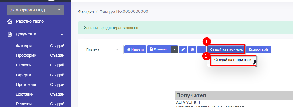 1.2. След като създадете фактурата на български език на страницата имате бутон Създай на втори език (1)