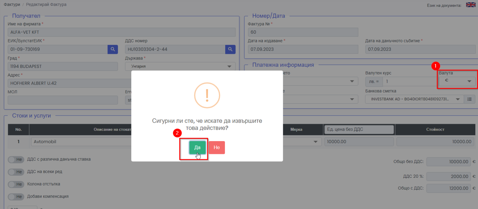 2. Зарежда се страница, в която можете да смените валутата за фактурата на английски език, след като изберете желаната валута ще Ви излезе съобщение да потвърдите превалутирането, което ще пресметне правилната сума по курса на деня на БНБ за избраната валута.