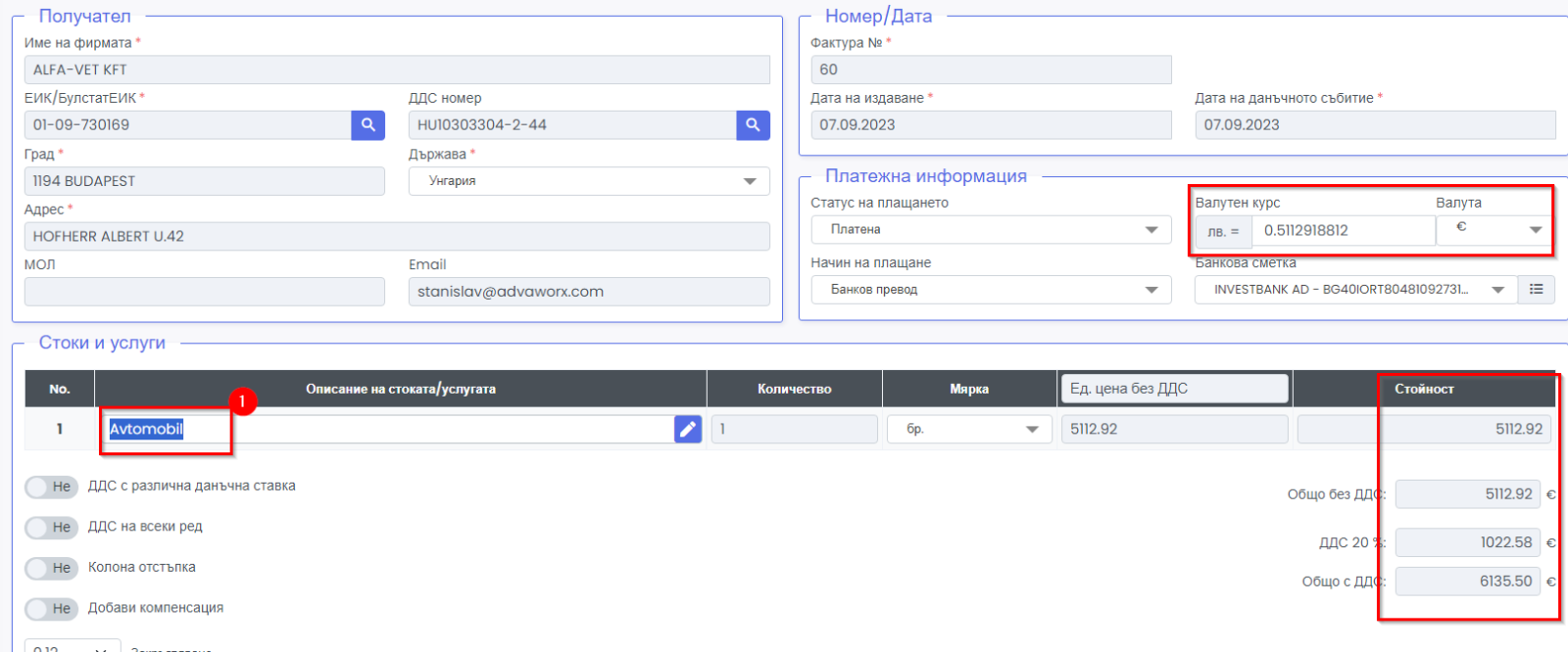 3. По подразбиране коригираме имената на стоките, които са на кирилица с латински букви, но можете да редактирате текстовете, за да са разбираеми за вашите клиенти. Ако не искате всеки път да ректирате текстовете можете от Склад/ Стоки услуги да редактирате продукта, където да сложите текста, който искате да излиза на английски език. Тъй като е вероятно крайна сума в избраната валута да се различава с малко от тази, която очаквате, можете да коригирате ръчно курса, до като се получи желата от вас крайна сума, за да стане по-лесно това трябва да разделите сумата във валутата, която искате да получите на сумата в лева примерно в евро: 650, в лева 1271: 650/1270= 0.5114083398898505